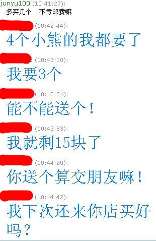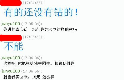 说卡里只有15元除去邮费 3元钱想买我4个熊!我想第一笔生意。本来就是亏得。就亏个底算了。