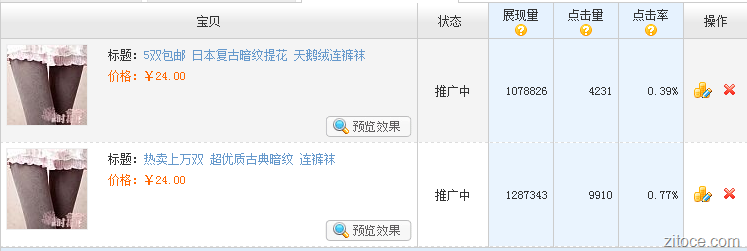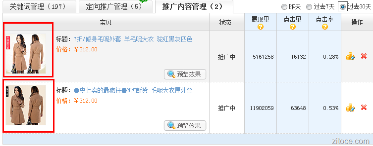 2个宝贝推广图片不一样,一个暗淡,一个清新明亮,logo不一样,事实证明还是暗的那个点击率高,体现高贵典雅深沉的概念在里面,点击率高一些