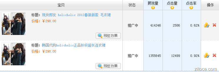 可以看到,可能影响点击的有宝贝推广图片,宝贝推广标题(注意连衣裙加红了,点击率高一点),宝贝价格,最近成交笔数