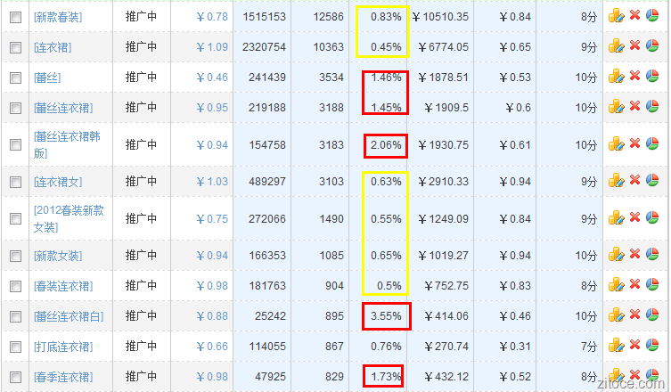 上图是某爆款连衣裙,点击率情况,是一款韩版白色蕾丝春装连衣裙,大家可以看到,蕾丝 白色 的词点击率比较高,而 连衣裙 春装新款等词点击率比较低,为什么呢,因为搜索蕾丝的流量比较精准,买家搜索到自己想买的宝贝,点击率怎么可能不高,我们常说的点击率高的词转化往往也不错,就是这个道理!
