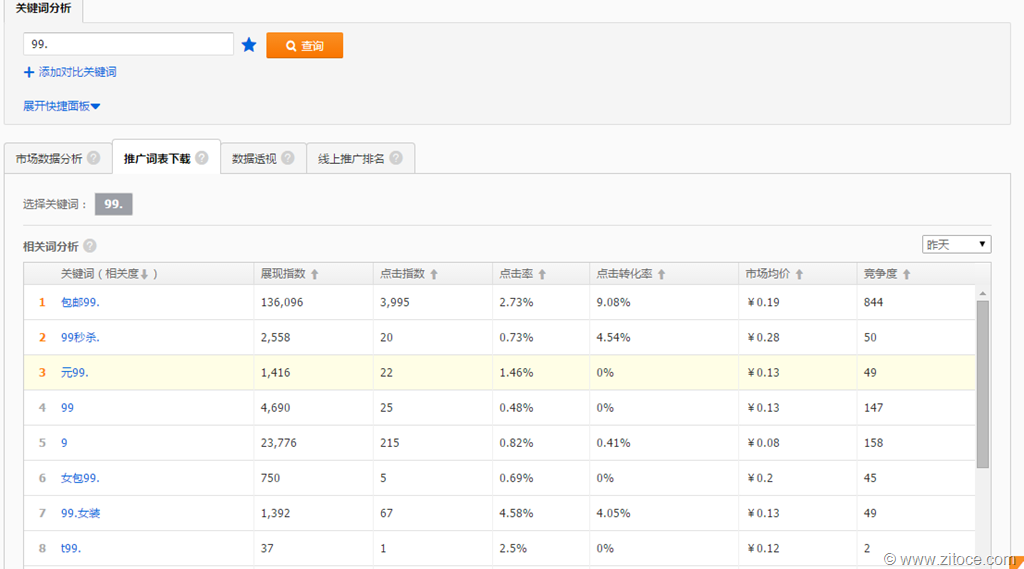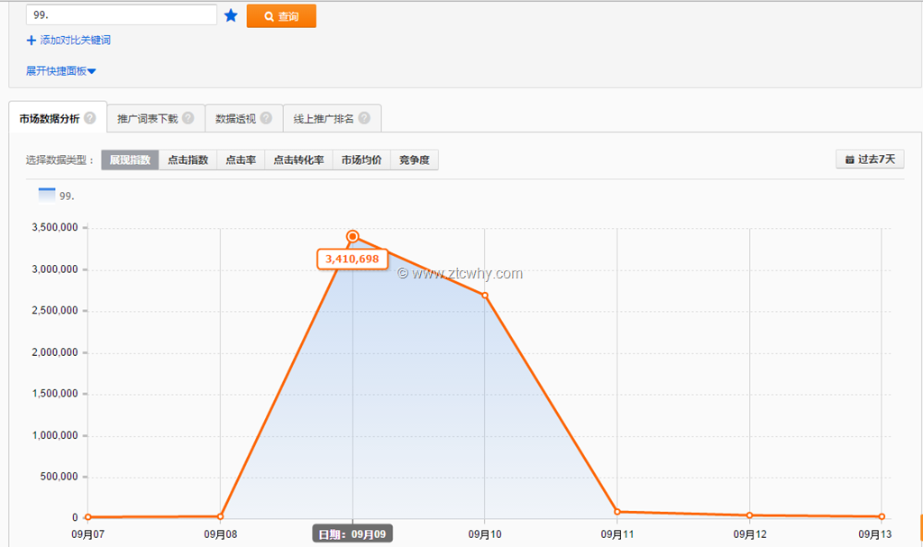 我们来看 99. 这个词 流量展现达到了340w,而竞争度只有674!