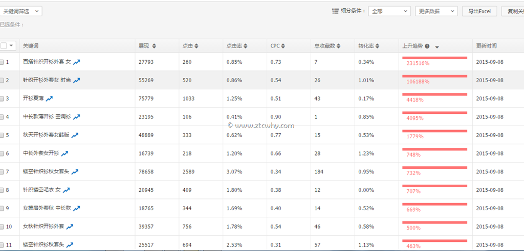 这个是针织衫类目的关键词上升榜,