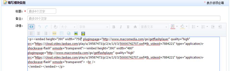 后台宝贝编辑,添加详情模块,增加视频,修改代码480-改成750即可