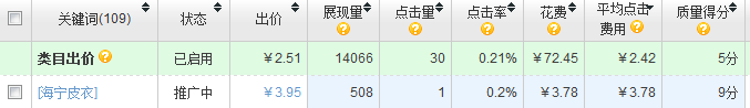 皮草行业宝贝有一个明显的特点就是价格非常贵,都是卖1500-3000的,转化率当然会低,淘宝上卖得也很多,海宁皮革城大概很多家都开淘宝店,所以海宁不投放,直通车词非常贵,很多9-10分的词,我都出到4块了,还没什么点击,如下图
